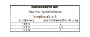 | खाद्याची मात्रा | गोवत्स हीफर खाद्याची मात्रा ही जनावरांच्या वयानुसार बदलत असते. कृपया गोवत्स हीफर खाद्याच्या वापराकरीता खालील कोष्टक पहावे. |